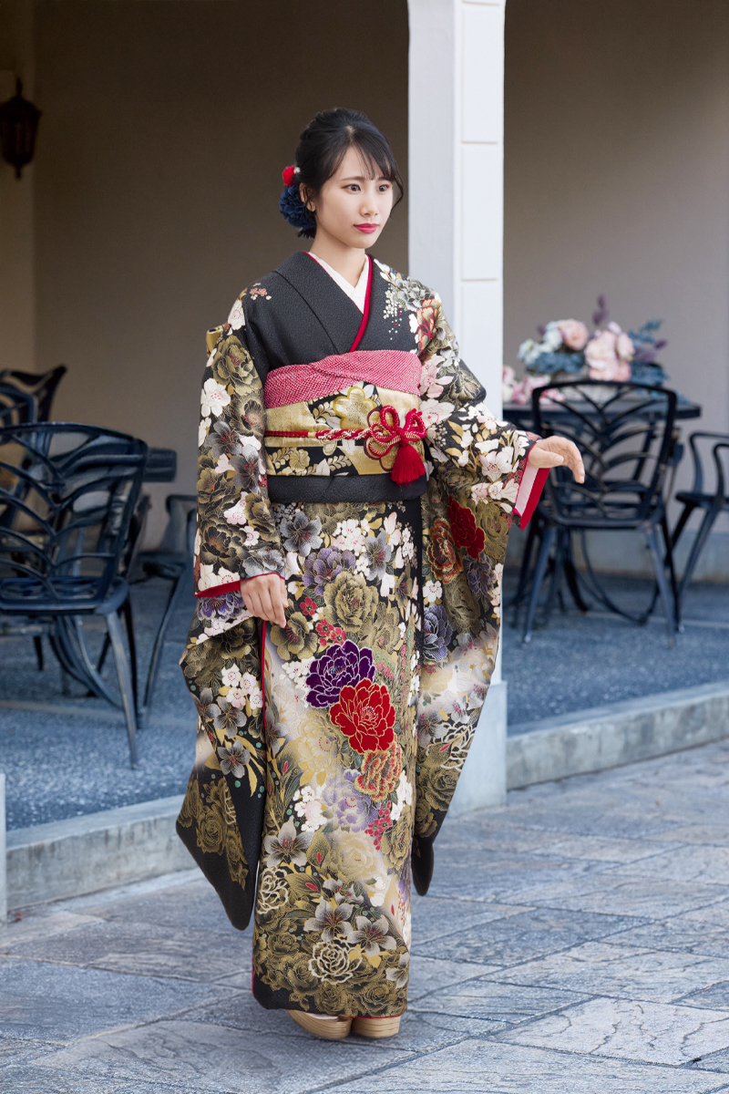 黒色紫色振袖:豪華な柄が映え、格調高く